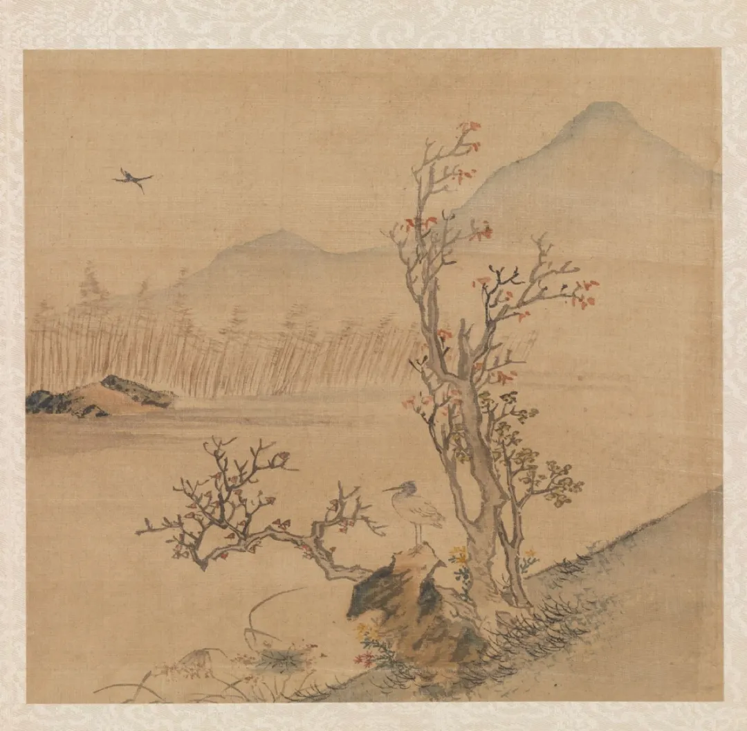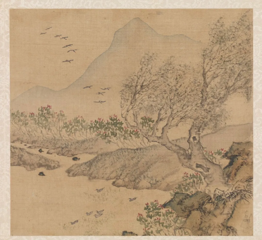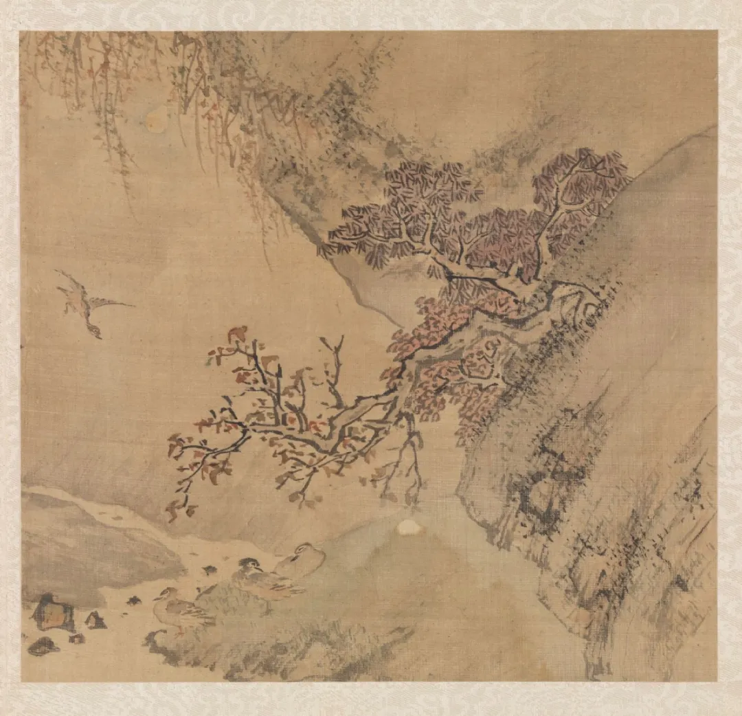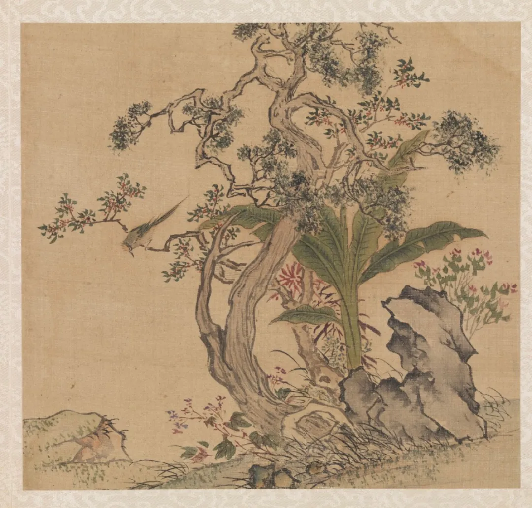 作为吴门画派的代表画家,周之冕的《写生册》洋溢着浓厚的文人气息。册中设色淡雅,以“鲜雅”为宗,避免了浓艳的俗气;构图则多取折枝小景,通过疏密、虚实的对比,营造出空灵的意境。在《秋林山鸟》中,画家以淡墨勾勒山石,再以赭石轻染,表现出秋日的萧瑟;而山鸟则以浓墨点染,与背景形成强烈对比,既突出了主体,又赋予画面以层次感。这种“以简驭繁”的构图方式,正是文人画“逸笔草草,不求形似”精神的体现。