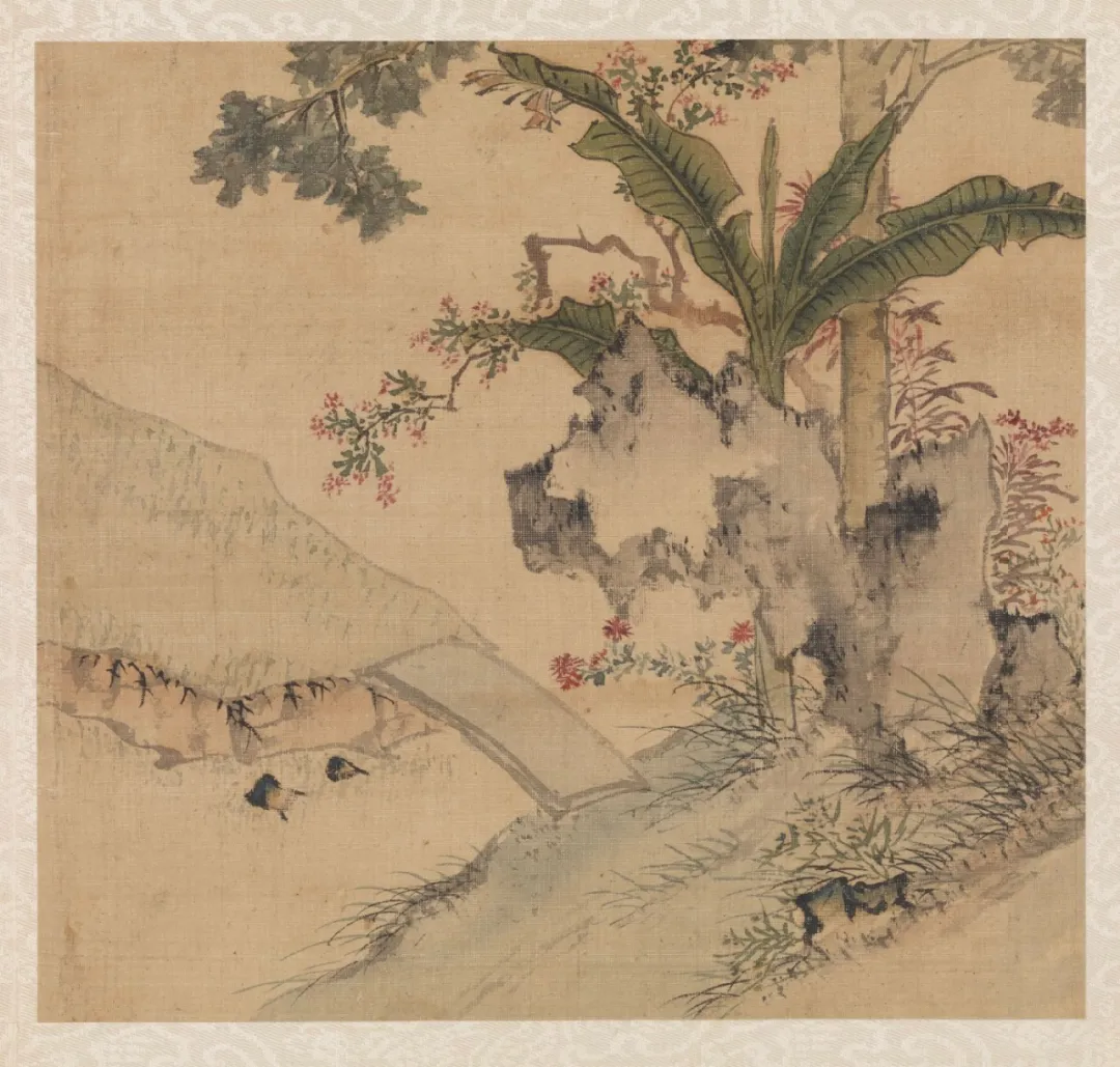 册中十幅小景,如《河浦鸳鸯》《石榴斗鸡》等,皆以“勾花点叶法”为核心:以细劲的铁线描勾勒花瓣轮廓,再以水墨或淡彩点染叶片,形成“骨法用笔”与“没骨写意”的完美融合。在《芭蕉奇石》中,芭蕉叶以浓墨点染,叶脉却以淡墨勾勒,通过墨色浓淡的对比,既表现出叶片的厚重质感,又赋予其随风摇曳的动态;而《水仙雉鸡》中的水仙,则以纤细的游丝描勾出花瓣,再以淡绿晕染,将水仙的清雅之姿展现得淋漓尽致。这种技法突破了传统工笔的刻板与写意的恣肆,在“工”与“写”之间找到了微妙的平衡。